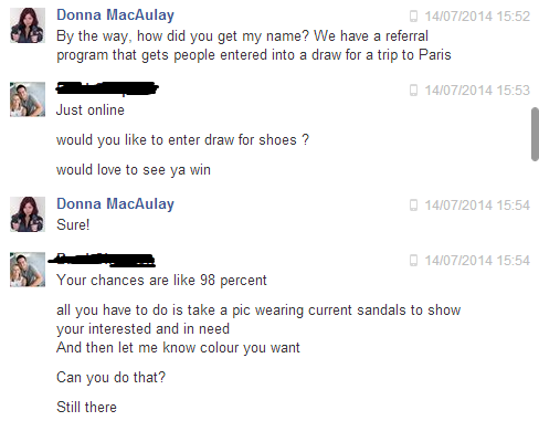 But I think to myself “I’ve seen weirder contests online. It’s unorthodox, but could still be legit. Besides, what do I care if they have a photo of my feet?” I send a picture, and directly begin trying to change the conversation to real estate. We talk houses for a while, then she starts asking if there is a doctor shortage in Ottawa. Ok. I tell her that there is a province-wide shortage of family doctors, but nothing specific to Ottawa. She tells me she lost an ovary to cancer, and needs pap tests every 3 months. I’ll let it slide, it’s a legit concern and probably not intended as an overshare. Then I get this: